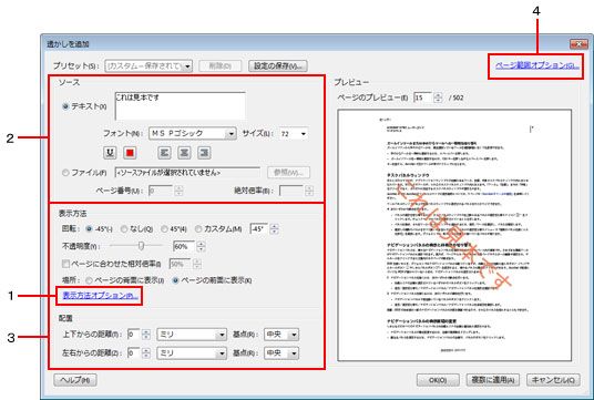 透かしを追加 ダイアログボックスでは、透かしに関して様々な設定を行うことができます。