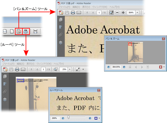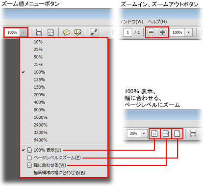 Adobe Reader には文書を拡大縮小表示するために、以下のような様々なツールが用意されています。