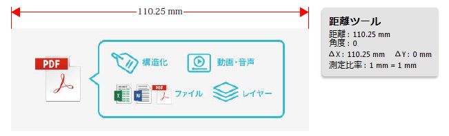 ものさしツールには、距離ツール、周辺ツール、面積ツールが用意されており、PDF 文書内にあるオブジェクトの間隔や、面積を測定したい場合に役立ちます。各ツールで測定したい箇所をクリックして線分を作成すると、測定値が表示されます。