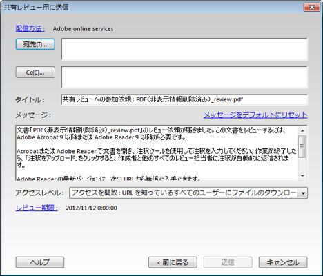別の日付を指定する場合または期限を指定しない場合は、ここをクリックします。レビュー期限を過ぎると、レビュー担当者は注釈をアップロードできなくなります。 - この文書について、ページ表示の共有およびチャットコラボレーションを許可する(Acrobat.com のみ)