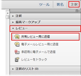 「注釈」ツールパネルウィンドウを開き、「レビュー」から「共有レビュー用に送信」をクリックします。