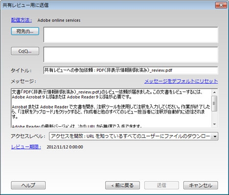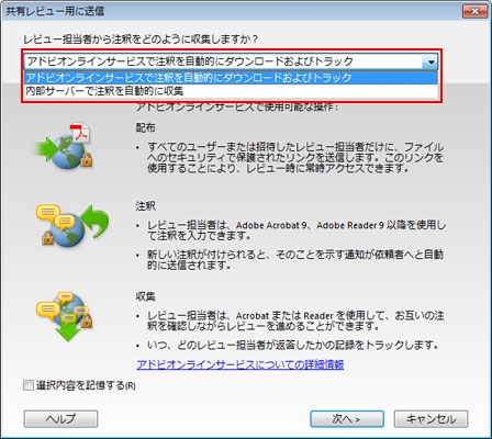 注意 : Acrobat.com 上で共有レビューを開始するには、Acrobat 9 以降がインストールされている必要があります。Acrobat.com 上の共有レビューの参加者は、Acrobat 9 以降、または Reader 9 以降が必要です。Acrobat.com 上以外の共有レビューの場合、レビュー担当者は、他のレビュー担当者の注釈を表示するために、Acrobat 8 以降、または Reader 8 以降をインストールしている必要があります。以前のバージョンの Acrobat を使用しているレビュー担当者は、電子メールで注釈を送信する必要があります。