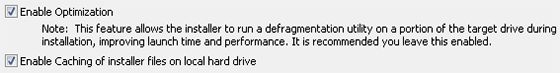 インストール処理中にドライブのデフラグを実行する場合は、Enable Optimization にチェックを入れてください。インストール中のプログレスバーにデフラグ処理が表示されます。ENABLE_OPTIMIZATION プロパティが設定されます。