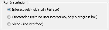 - Unattended (with no user interaction, only a progress bar) : すべてのインストール画面を非表示にし、インストーラーが実行している時にプログレスバーのみ表示します。このオプションを選択した場合、再起動セクションで Reboot without prompt または Suppress reboot を選択することを推奨します。setup.ini コマンドラインは/spb に設定されます。