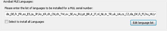 Acrobat のインストーラーはすべて MUI(全言語対応)のインストーラーですが、使用する言語に応じたライセンスを指定する必要があります。英語は常に利用可能です。All Language(全言語)のシリアル番号を購入し、全言語版へのアクセスを取得することも可能です。MUI Installation Languages でオプションを変更しなかった場合は、「全言語」のシリアル番号で、オペレーティングシステムの言語に合わせてインストールされます。Customization Wizard 上ではシリアル番号の認証は行われないため、ライセンスに応じて言語設定が適用されます。例えば、ユーザーが指定した言語コードがシリアル番号のライセンスと一致しない場合、インストールは失敗してエラーになります。