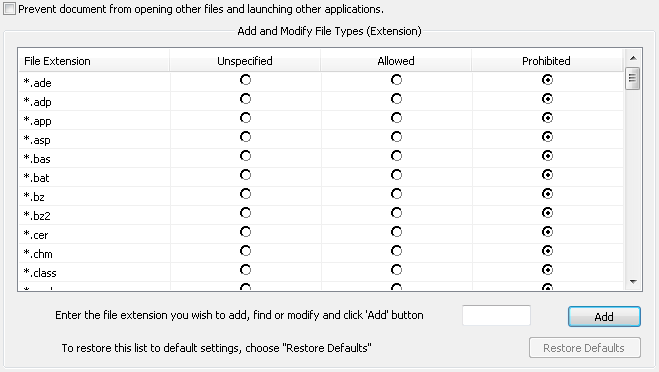 注意 : 初期設定のファイル形式(PDF/FDF を除く)へのアクセスレベルは「Prohibited」に設定されています。リストに追加した新しいファイル形式は削除されます。