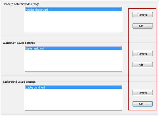 Acrobat の場合、ヘッダー、フッター、透かし、背景のファイルを指定できます。この情報は EnterpriseFiles インストーラーテーブルに書き込まれます。
