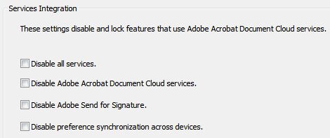 Disable all services : この新しい設定項目は、廃止予定の HKCU サービスマスタースイッチ bEnableAcrobatHS に置き換わるものです。すべての Adobe サービスに加え、Web プラグインコンポーネントへのアップデートが無効になります。これは FeatureLockdown 直下の bUpdater とは異なるもので、製品アップデートを無効にします。