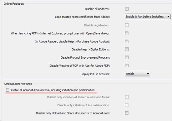 例えば、Adobe Reader X 起動時に表示される「アドビオンラインサービス」を全て無効にする場合は、「Disable all Acrobat.com access, including invitation and participation」にチェックを入れます。