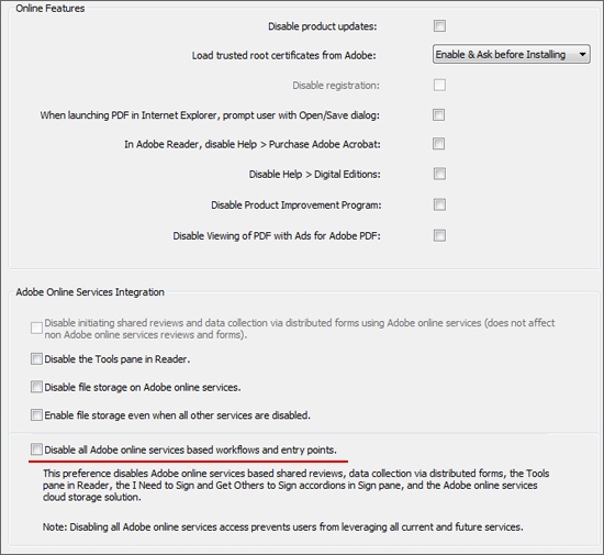 - 「Adobe Online Services Integration」セクションでは、Acrobat.com や EchoSign などのオンラインサービスと連携する機能を設定することができます。