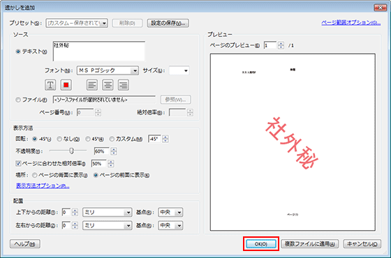必要に応じて「表示方法」や「配置」セクションで設定を行い、「OK」をクリックして透かしを追加します。