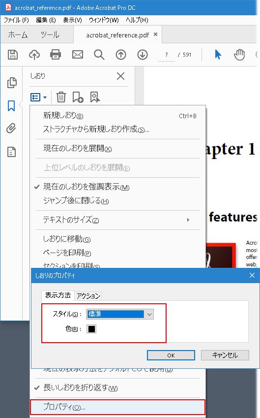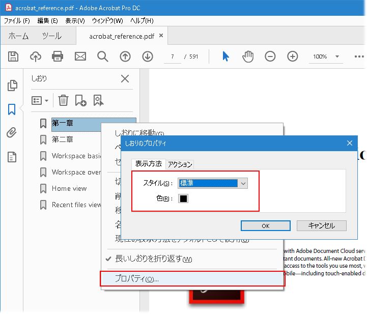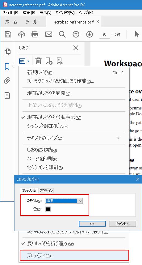 • しおりパネルのオプションメニューから「プロパティ」を選択します。しおりのプロパティ ウィンドウで、必要に応じてスタイルと色を指定します。