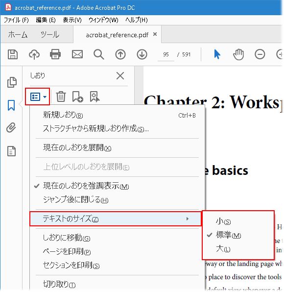 しおりパネルのオプションメニューを開き、「テキストのサイズ」からサイズを選択します。