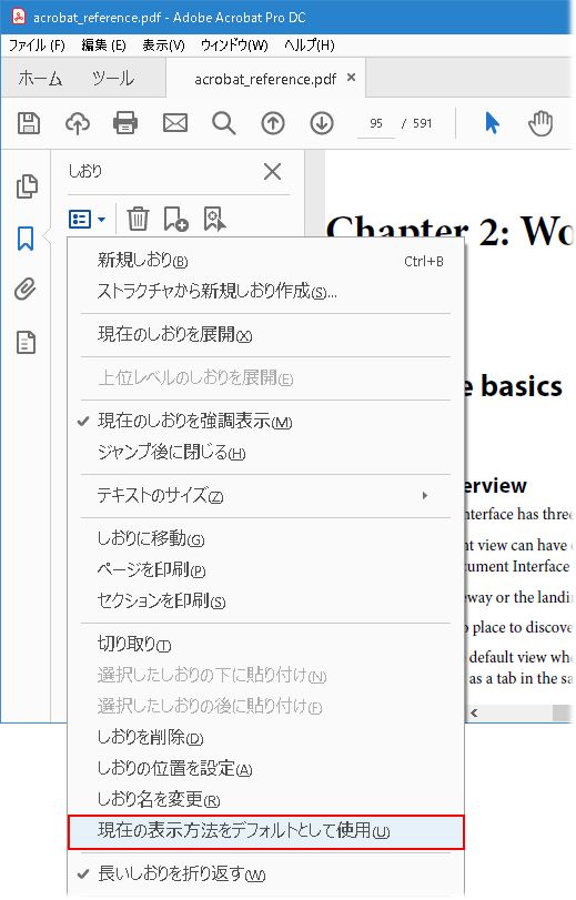 しおりの表示方法を定義した後で、その設定を基本設定として利用することができます。基本設定にするには、しおりを選択し、オプションメニュー から「現在の表示方法をデフォルトとして使用」を選択します。