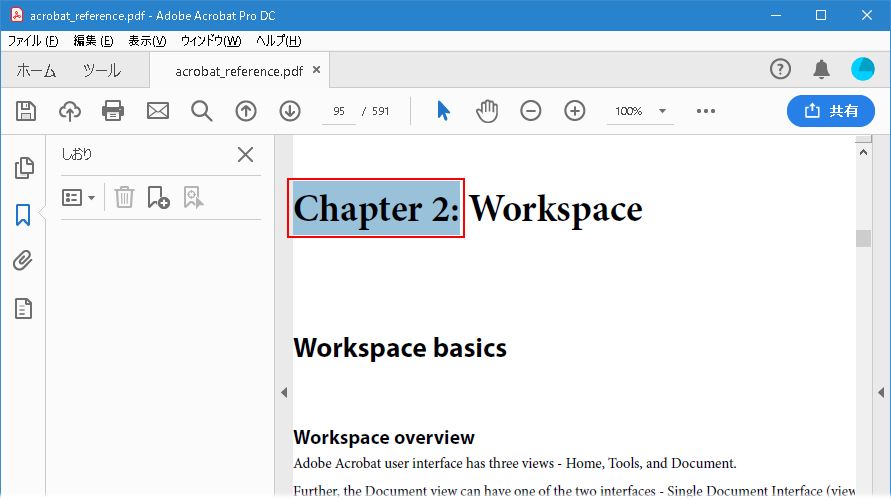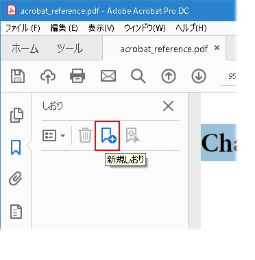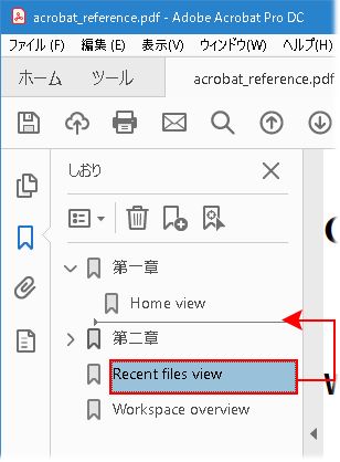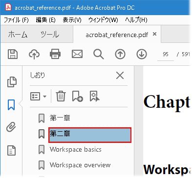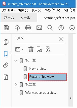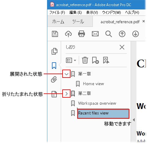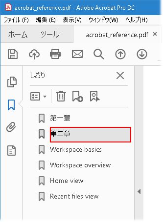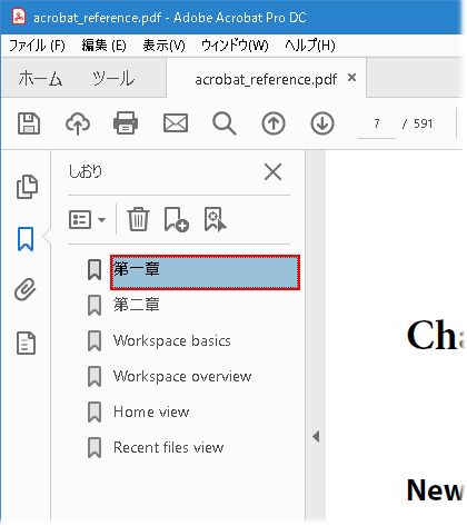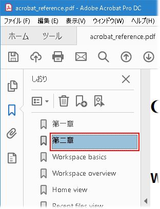 Acrobat では、PDF 内の章や節などの構成に合わせてしおりを作成することができます。しおりとはリンクの一種で、書籍の目次のような役割をします。