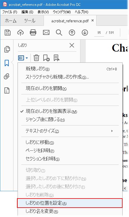 4. しおりパネルのオプションメニューから「しおりの位置を設定」を選択します。