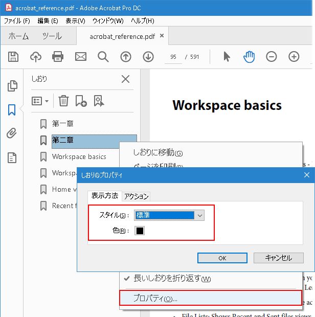 • しおりパネルのオプションメニューから「プロパティ」を選択します。しおりのプロパティ ウィンドウで、スタイルと色を指定します。