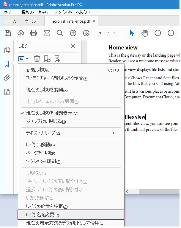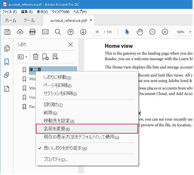 • 右クリックし、メニューから「名前を変更」を選択して、新しいしおりの名前を入力します。