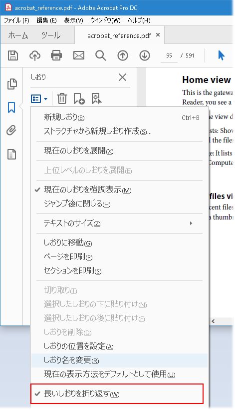 オプションを有効にするには、「しおり」パネルのオプションメニューから、「長いしおりを折り返す」のチェックを入れます。