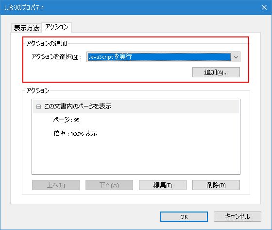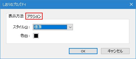 3. しおりのプロパティウィンドウで、「アクション」タブを開きます。