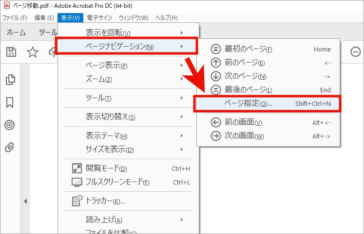 表示 メニューの 「ページナビゲーション」からも同様の操作が行えます。ページナビゲーションから「ページ指定」を選択すると、ページ指定 ダイアログボックスが表示され、ページ番号を入力してそのページに移動することができます。