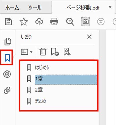 「しおり」のある文書では、しおり タブで PDF 文書の目次にあたる項目を指定して別のページに移動することができます。