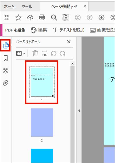 ページサムネールでは、プレビュー用に縮小表示された画像をページ タブで確認しながら、別のページに移動することができます。ページサムネール タブで、ページの表示部分や表示比率を変更したり、別のページに移動することができます。ページ内のどの部分が表示されているかを、サムネールに表示されるボックスで示します。