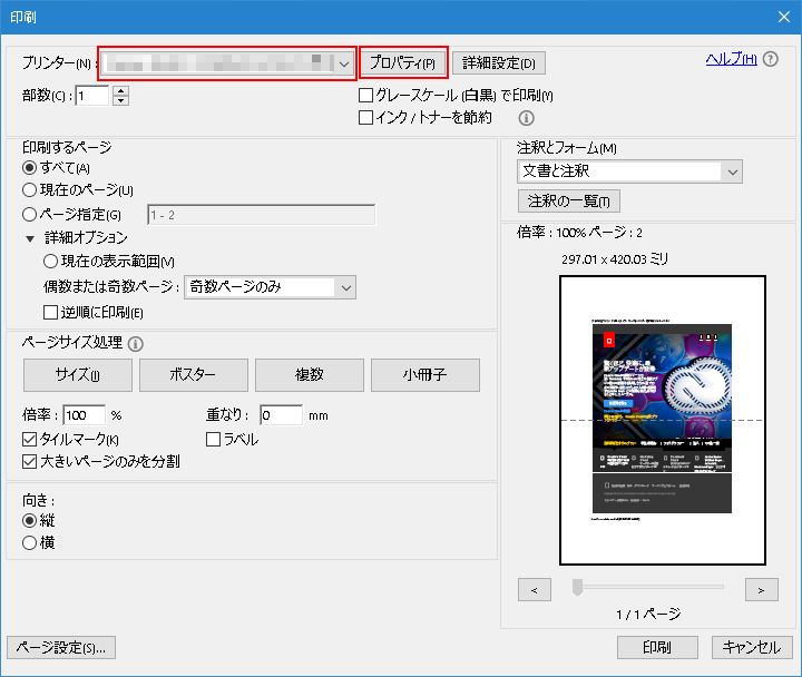 印刷するプリンターを選択し、「プロパティ」ボタンをクリックします。
