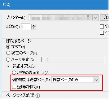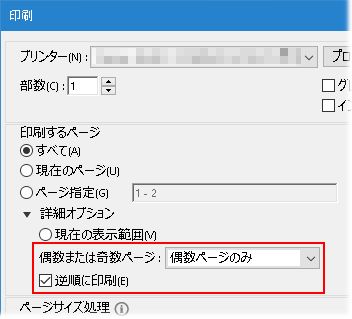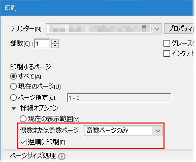 「印刷するページ」セクションで詳細オプションを開いて「奇数ページのみ」を選択し、「逆順に印刷」にチェックを入れます。