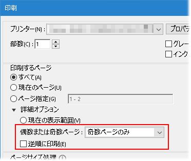「印刷するページ」セクションで詳細オプションを開き、「奇数ページのみ」を選択します。(ここでは「逆順に印刷」のチェックをはずしてください。)