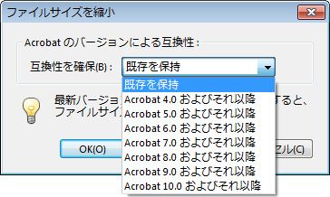 Acrobat には、PDF ファイルのファイルサイズを縮小する機能が用意されています。PDF の互換性を指定することにより、ファイルサイズを軽減します。新しいバージョンを選択することにより効果が得られます。