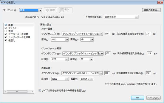Acrobat の PDF 最適化機能を使用することにより、以下の設定を細かく指定して、PDF ファイルを最適化することができます。最適化を行うことにより、多くの場合はファイルサイズが軽減されます。