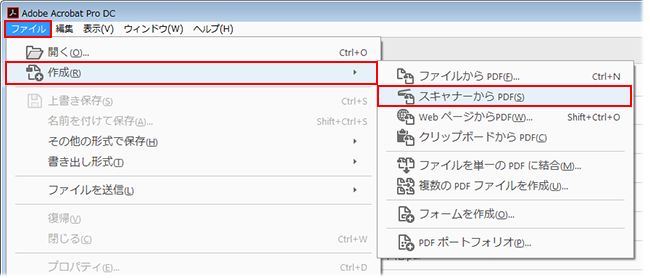 Acrobat を起動し、ファイル/作成/スキャナーから を選択します。