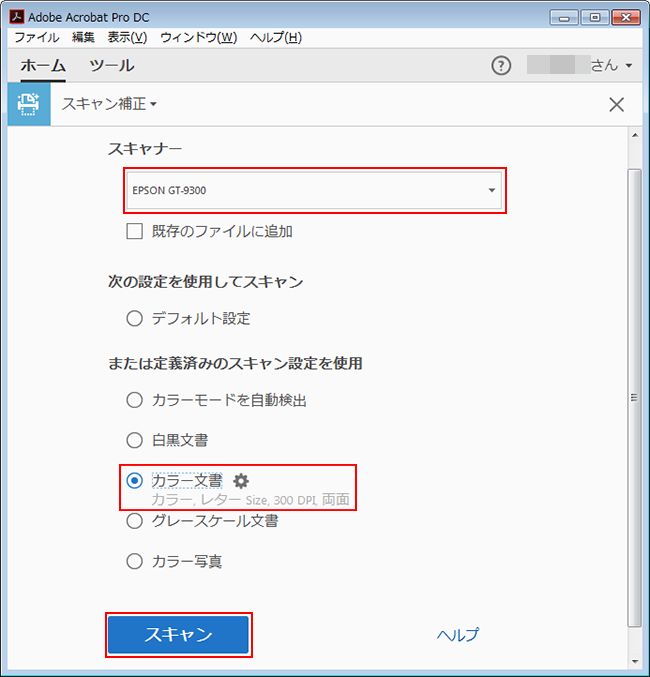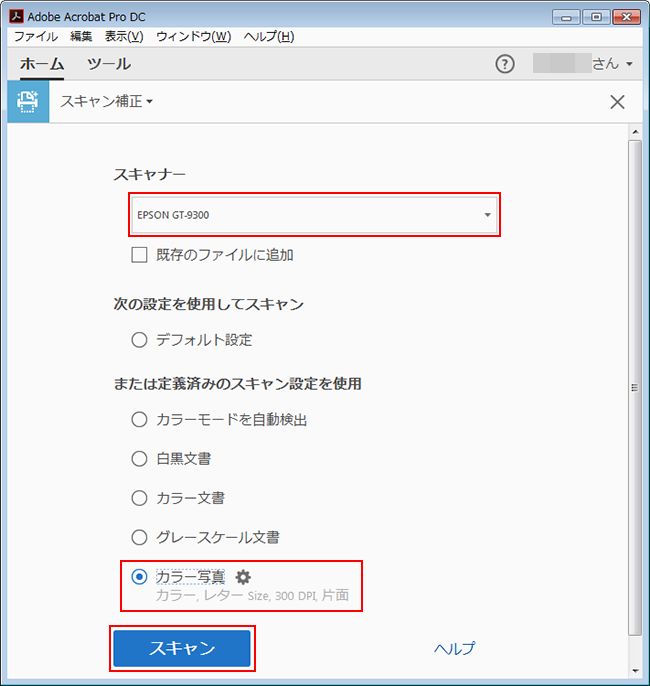 「スキャナー」に接続したスキャナー名が表示されていることを確認します。