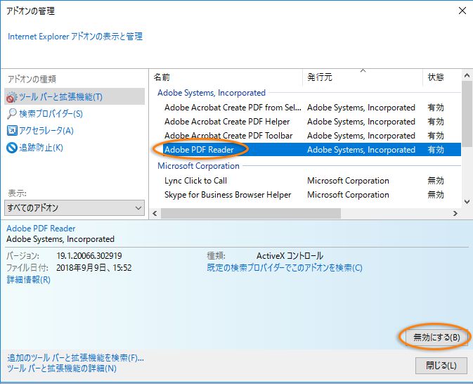 「Adobe PDF Reader」を選択し、「有効にする」ボタンまたは「無効にする」ボタンをクリックします。 「Adobe PDF Reader」を選択し、「有効にする」ボタンまたは「無効にする」ボタンをクリックします。 詳しくは、Internet Explorer のヘルプトピック「Internet Explorer のアドオンを管理する」を参照してください。
