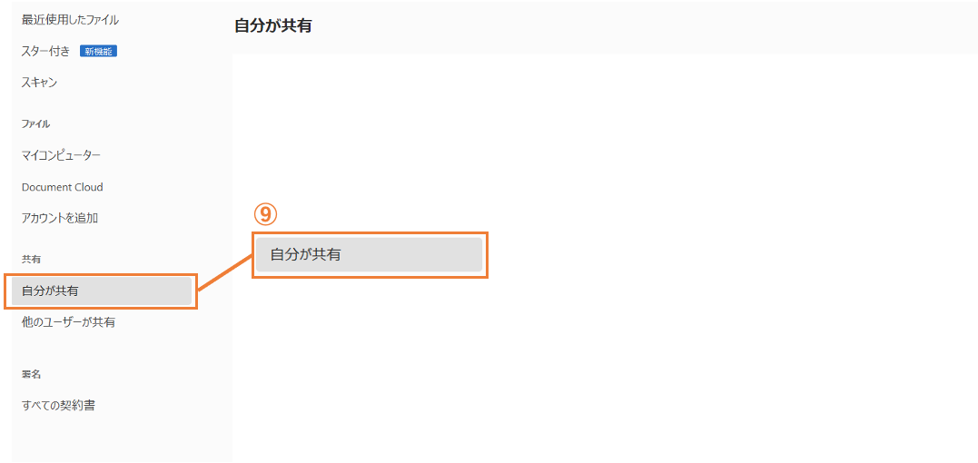 5 送信者はAcrobatで、送信済みファイルをトラックすることができます。「ホーム」タブをクリックし、「共有」→「自分が共有」⑨を選択すると、共有したファイルがリストに表示されます。ファイルを選択すると、画面の右にファイルの情報が表示されます。⑩
