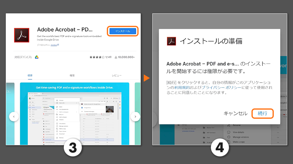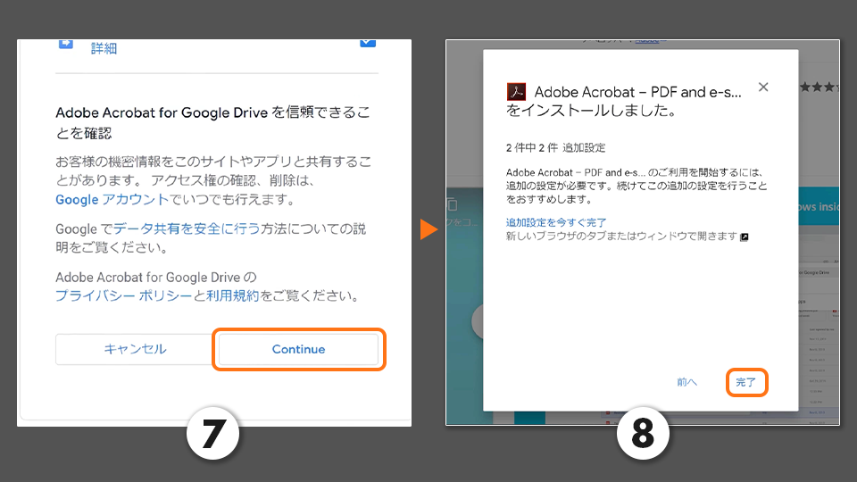 7. Adobe Acrobat for Google Driveを信頼できることを確認し、「Continue」をクリックしてインストールを続行します。
