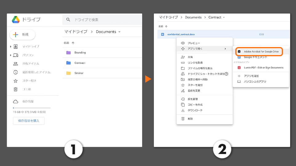 2. PDFに変換したいファイルで右クリックし、「アプリで開く」-「Adobe Acrobat for Google Drive」を選択します。