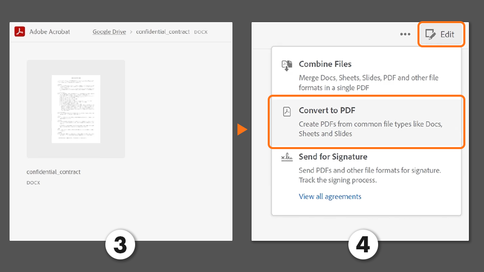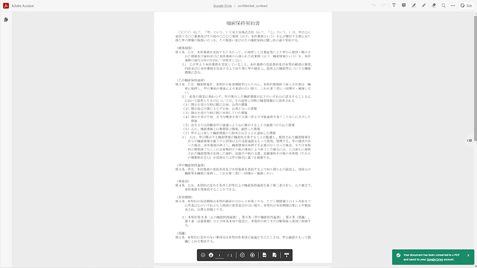 Google DriveにAdobe Acrobatアプリを追加すると、Webブラウザ内でWordなどのファイルをPDFに変換し、使用することができます。いつでもどこでも素早くPDFを使えるようになるので、とても便利です。