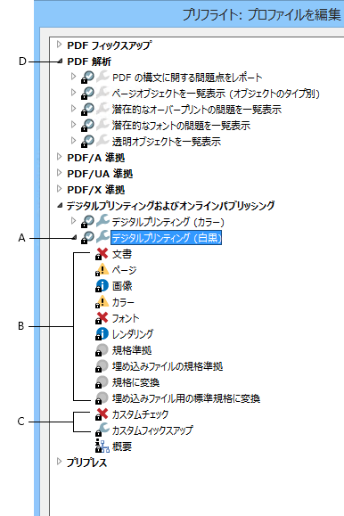 Adobe Acrobat には定義済みのプリフライトプロファイルがいくつか用意されており、「デジタルプリンティング」、「PDF 解析」、「プリプレス」、「PDF/A、PDF/E または PDF/X 準拠」などのグループに分けられています。定義済みのプロファイルを使用することも、変更してカスタムプロファイルを作成することもできます。プロファイルを構成するチェック(以前のバージョンの Acrobat では規則)は、「文書」、「ページ」、「画像」などのカテゴリごとにまとめられています。1 つのカテゴリに属する各チェックは、文書の特定のプロパティを制御します。