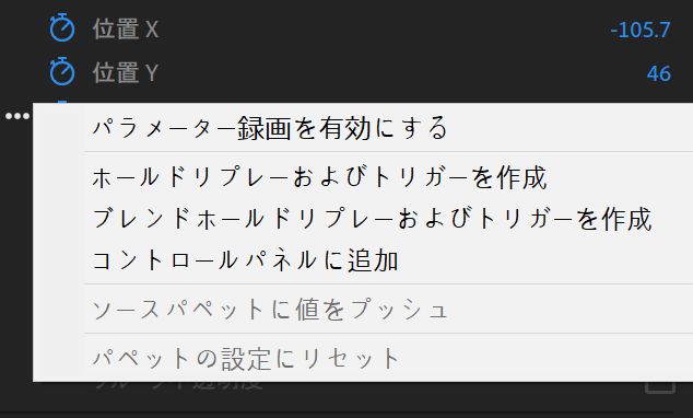 )アイコンをクリックして、「パラメーター記録の有効化」 を選択します。有効にすると、パラメーターの横に赤い点が表示されます。 記録中にパラメーターの値を変更した場合は、すべての変更を含む新しいテイクが作成されます。テイクについて詳しくは、テイクの録画を参照してください。パラメーターにキーフレームとテイクの両方がある場合、テイクが優先されます。