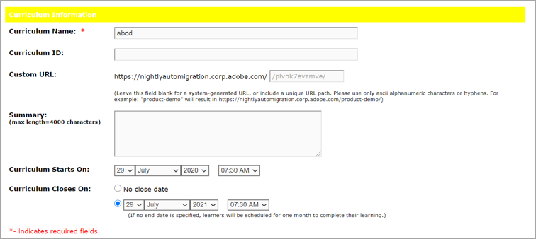 新規カリキュラムウィザードの最初のページでは、概要、開始日、終了日など、カリキュラムの詳細を入力できます。 カリキュラム名は入力する必要がありますが、その他のフィールドは省略可能です。 このウィザードで入力した情報は、カリキュラム情報ページと、登録者が「マイトレーニング」リンクからアクセスするページに表示されます。