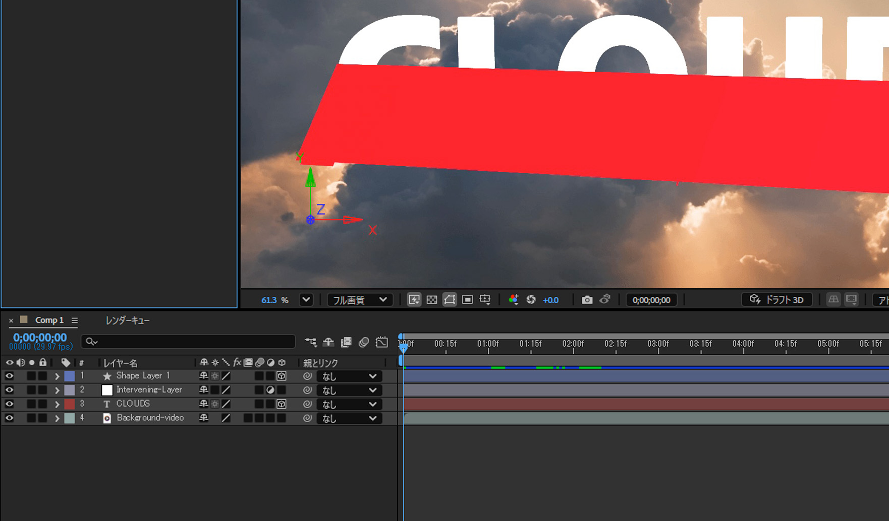 が選択されている状態)は、プリコンポジション内のすべてのレイヤーが 3D レイヤーである場合は、3D レイヤーのインタラクションには影響しません。 コラップストランスフォームは、プリコンポジションを構成しているレイヤーの 3D プロパティを有効にします。 基本的に、このような場合のコラップストランスフォームでは、プリコンポジションレイヤーを単一の 2D レイヤーとしてメインのコンポジション上に合成するのではなく、プリコンポジション内の各 3D レイヤーが個々にメインのコンポジション上で合成されます。 その代わり、プリコンポジションレイヤーにコラップストランスフォームを適用すると、描画モード、画質、モーションブラーなどの特定のレイヤー設定が使用できなくなります。