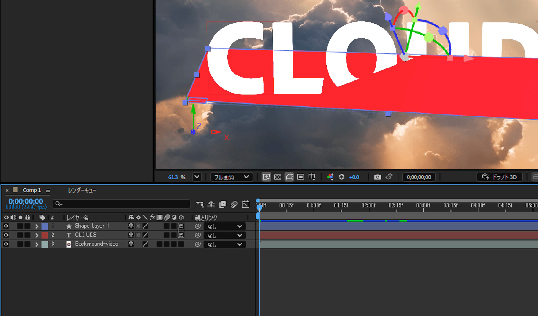 - コンポジションパネルで、選択ツールを使用して、レイヤーを移動する軸に対応する 3D 軸レイヤーコントロールの矢印をドラッグします。 Shift キーを押しながらドラッグすると 、レイヤーをよりすばやく移動できます。