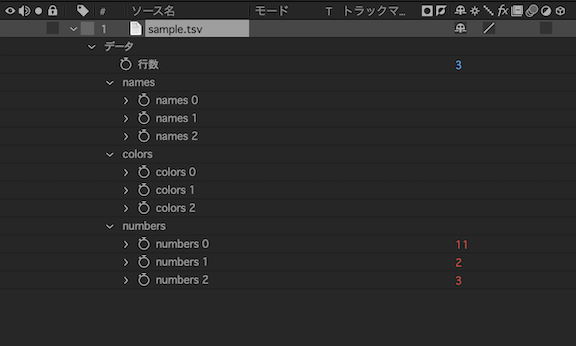 JSON、CSV または TSV ファイルをコンポジションに追加してプロパティを開くと、プロパティには、トランスフォームプロパティグループではなくデータプロパティグループのみが含まれています。データプロパティグループには、ファイルで定義されているデータの階層が含まれています。