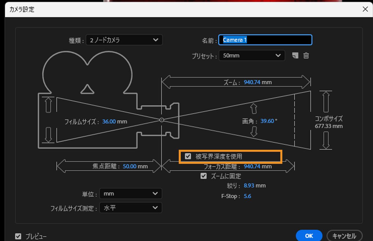 カメラ設定ダイアログボックスで、被写界深度を有効にするオプションを選択します。