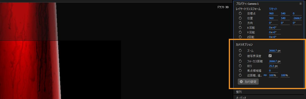 カメラオプションセクションのプロパティまたはタイムラインパネルのコントロールを使用して、以下を調整します: