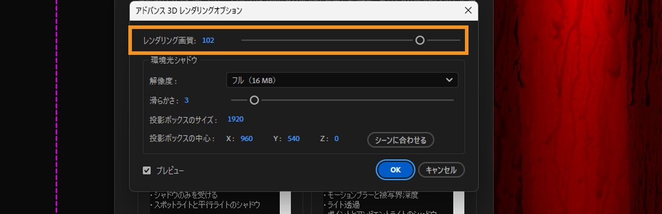 レンダリングオプションのレンダリング品質スライダーを使用して、レンダリング品質とパフォーマンスのバランスを調整します。 レンダリングオプションのレンダリング品質スライダーを使用して、レンダリング品質とパフォーマンスのバランスを調整します。