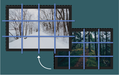 レイヤーのエッジやマスクのエッジをグリッドまたはガイドにスナップさせるには、ビュー/グリッドにスナップまたはビュー/ガイドにスナップを選択します。
