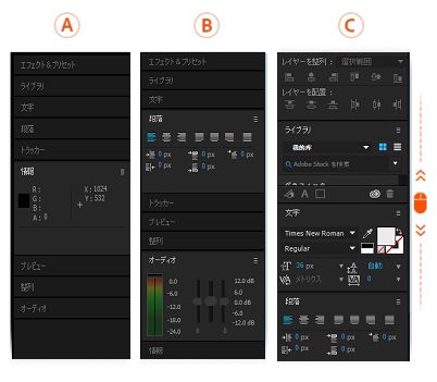 重なった状態のパネルグループを使用すると、通常は After Effects ワークスペースの右側に表示されるパネルを表示および非表示にできます。